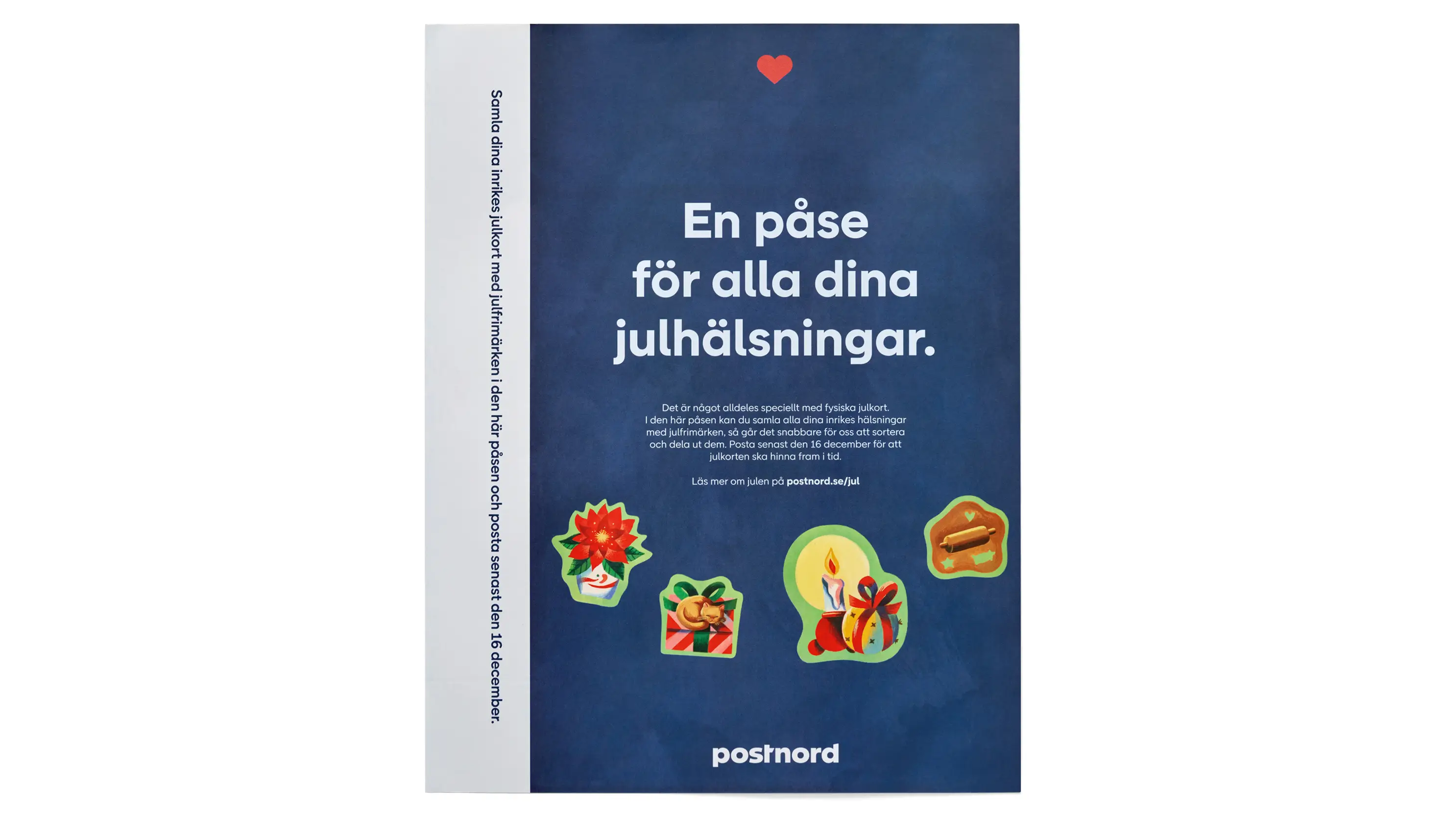 Vi är så tacksamma om du väljer att använda julkortspåsen när du skickar dina julkort, eftersom det underlättar för oss på brevterminalerna när vi har högt tryck under julen. Alla hushåll som tar emot reklam får julkortspåsen i postlådan.