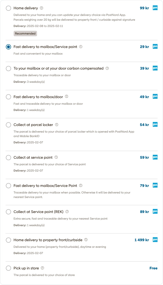 En fraktväljare för dina kunders nätbutiker. Säkerställ optimal exponering och enkelt val av PostNords frakttjänster.